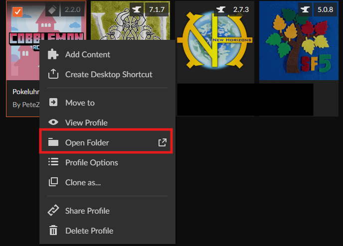 Se rendre sur CurseForge puis faites un clic droit sur le modpack. Ensuite cliquez sur "Open Folder"