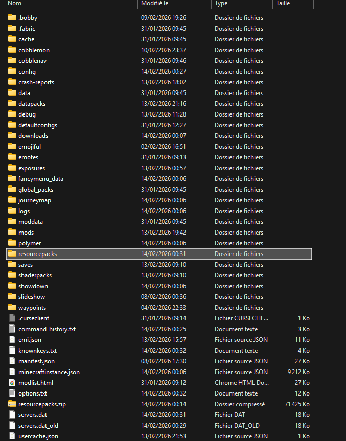 Une fois dans le dossier du modpack, SUPPRIMER LE DOSSIER "RESSOURCEPACKS" puis ajouter le nouveau